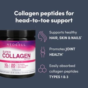 Collagen is the body’s key structural protein, responsible for maintaining smooth, youthful skin, thick and glossy hair, strong nails, and flexible joints. As we age, natural collagen levels decline, leading to visible signs of aging and reduced mobility. NeoCell Super Collagen Peptides delivers a concentrated dose of Type 1 and Type 3 hydrolyzed collagen, specially formulated for superior absorption, helping you replenish what time takes away.
